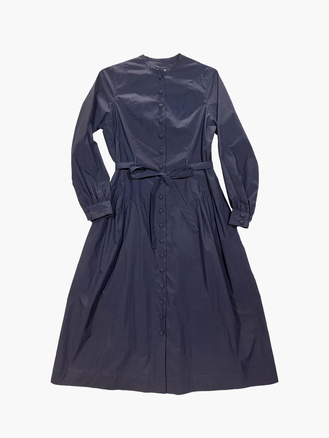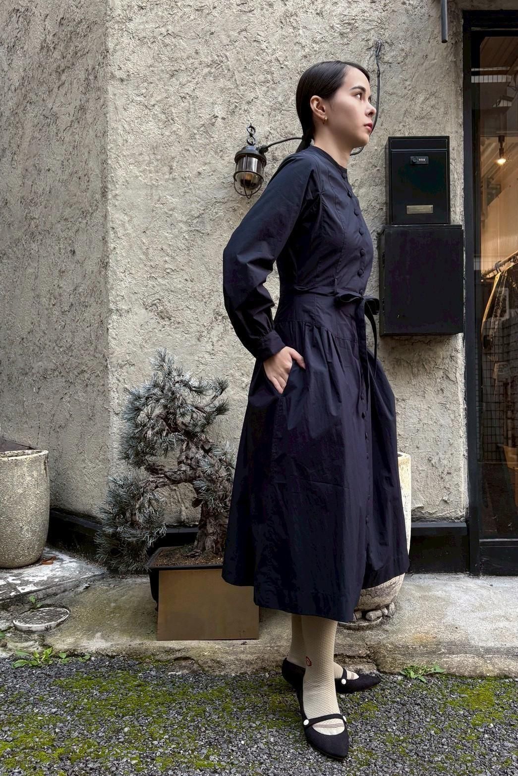 背中に添うような縦の切替がYAB-YUMらしい前開きのワンピース。従来のSサイズに加え、今シーズンは少しゆとりのあるMサイズを展開しました。着画のようにベルトを絞めれば細身の方でもMサイズをバランス良くお召しいただけます。また袖にはカフスが付き、気品ある一枚となりました。